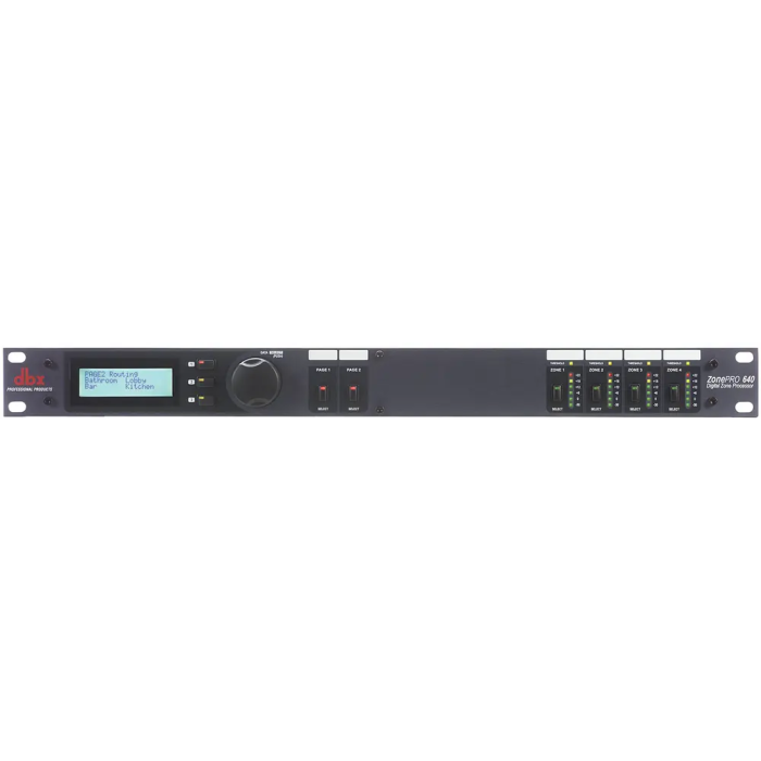 Con 6 entradas y 4 salidas, el dbx ZonePRO® 640 proporciona una enrutamiento de señal flexible, un potente procesamiento DSP y múltiples interfaces de control para aplicaciones de audio comercial.Diseñado para ofrecer un rendimiento sónico superior del sistema y flexibilidad, el 640/641 ofrece las herramientas de mayor calidad disponibles. Incluso los conectores de entrada y salida fueron seleccionados por su uso estándar y fiabilidad. Los productos ZonePRO ofrecen conectores Euroblock para señales balanceadas y conectores RCA para la interfaz con equipos de consumo que a menudo se usan en aplicaciones comerciales, también hay un bus de entrada analógico simple que permite que las entradas se envíen de una unidad a la siguiente para la escalabilidad de la unidad y el trabajo. El 640 y 641 brindan todas las herramientas de procesamiento necesarias, desde el procesamiento de entrada como control de ganancia y ecualización disponibles en todas las entradas hasta funciones altamente sofisticadas y específicas, como el procesamiento seleccionable para micrófonos de paginación, que incluye Gating, De-Essing, Control Automático de Ganancia, Compresión y Supresión de Retroalimentación. El corazón de los productos ZonePRO es el módulo de enrutamiento que proporciona, por supuesto, la selección de fuente primaria pero también la atenuación de fuente para paginación y anulación de prioridad. Las salidas también ofrecen una gran cantidad de procesamiento diseñado para aplicaciones comerciales como nuestra función patentada AutoWarmth®, que fue desarrollada conjuntamente con JBL para proporcionar una extensión de baja frecuencia natural a cualquier nivel de señal. Cada salida también ofrece ecualización, filtros de paso de banda y cruce, limitación y retardo para la optimización del sistema. Con el ZonePRO® cada herramienta está a tu disposición para maximizar la respuesta de tu sistema.Más allá del procesamiento, los productos ZonePRO® ofrecen múltiples formas de control para extender aún más la versatilidad de tu sistema. Desde los fáciles de usar paneles de control de zona montados en la pared para funciones estándar del usuario final, como la selección de fuente y control de volumen, hasta el control avanzado del sistema que incluye un reloj en tiempo real incorporado que puede proporcionar cambios programables en el sistema a lo largo del día o de la semana. Para la configuración y monitoreo del sistema, el software ZonePRO Designer proporciona una interfaz intuitiva y un asistente de configuración rápida para configurar y editar todos los parámetros del sistema.El ZonePRO® 640 llevará tu sistema de audio comercial al siguiente nivel con procesamiento avanzado, versatilidad y control.Características? Supresión de retroalimentación avanzada (AFS?)? Autowarmth®? Control automático de ganancia? Compresión? Limitante? Puerta de ruido? Filtrado de muescas? Filtros de paso de banda y de cruce? Ecualizador paramétrico? Bloqueo de seguridad? Control del panel de pared? Control RS-232? GUI de Windows® 2000 y XP? Aprobaciones IEC, UL y CSA