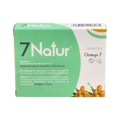 Indicaciones: 7Natur® es un complemento alimenticio a base de aceite puro estandarizado de Espino amarillo (Hippophae rhamnoides, fruto) aportando su contenido de omegas 7, 9 y 6. Con vitamina A, que contribuye a mantener piel y mucosas en condiciones normales.