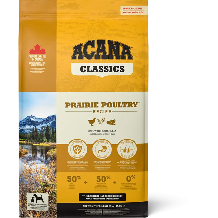 Alimento completo y equilibrado para perros adultos de todas las razas. Acana Canine Prairie Poultry 14,5 kg está formulado con ingredientes frescos y de alta calidad, incluyendo pollo y pavo de corral. Su receta rica en proteínas y baja en carbohidratos promueve una salud óptima y un peso corporal ideal. Ideal para perros con un estilo de vida activo.