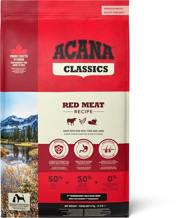 Acana Canine Red Meat es un alimento seco para perros de la prestigiosa marca Acana. La presentación es de 9,7 kg, ideal para dueños que buscan una opción conveniente y de gran tamaño. Este producto ofrece una fórmula rica en carne roja, diseñada para satisfacer las necesidades nutricionales de tu perro. Con Acana, puedes confiar en la calidad de los ingredientes y el equilibrio de la dieta para mantener a tu compañero canino saludable y lleno de energía. El envase de 9,7 kg asegura que tendrás alimento suficiente para un período prolongado.