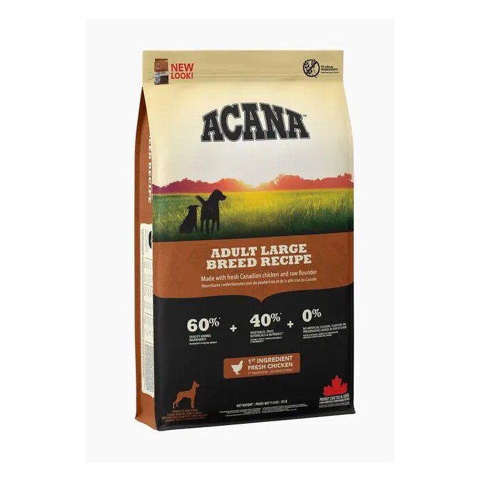 Los perros de raza grande comparten la misma anatomía que su ancestro, el lobo gris, y por lo tanto, tienen la misma necesidad biológica de una dieta rica y variada en ingredientes animales frescos y enteros. ACANA Adult Large Breed está formulado para satisfacer las necesidades nutricionales de perros de razas grandes.