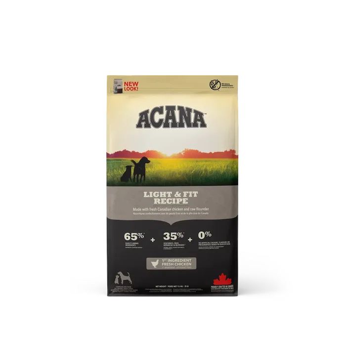 ACANA Light & Fit es un alimento completo para perros con sobrepeso. Su receta está repleta de ingredientes de alta calidad, como pollo de corral (20,5%), pollo deshidratado (20%), platija salvaje (4%) y huevos frescos de corral (4%), que proporcionan una dieta rica en proteínas para mejorar la masa muscular, aunque limitada en carbohidratos para ayudar a controlar el exceso de grasa corporal.