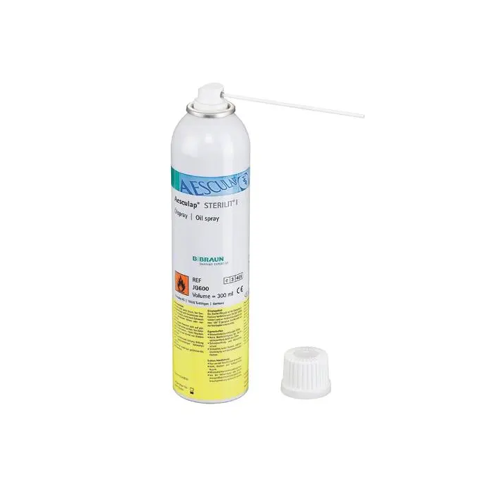 El Aceite Instrumental Sterilit Esculap Spray de B. Braun, con una capacidad de 300 mL, está diseñado para la lubricación y conservación del instrumental quirúrgico.