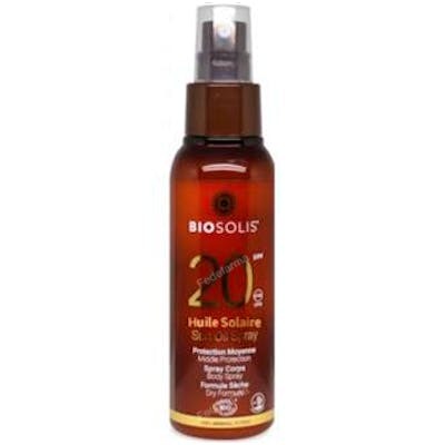 Indicaciones: Compuesto por aceites vegetales y filtros minerales, el Aceite de protección solar SPF20 ofrece una protección natural. Se puede aplicar sobre el cuerpo y el cabello. Los protectores solares de Biosolis resisten el agua y la transpiración. Producto vegano. Cosmebio, Ecocert.