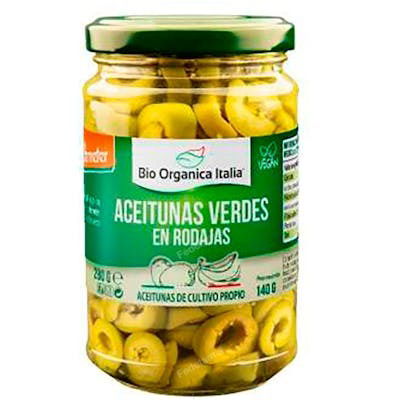 Aceitunas verdes en rodajas, conservadas en salmuera.