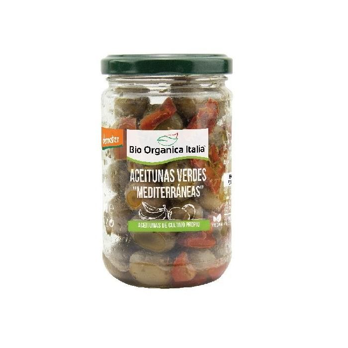 BIO ORGANICA ITALIA Aceitunas Verdes Mediterraneas Aliñadas con Aceite de Oliva Virgen Extra y Especias 180Gr