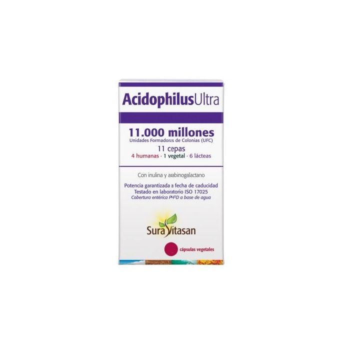 de microorganismos viables por cápsula, ver información nutricional) (en contacto con leche y soja), inulina (de raíz de achicoria, Cichorium intybus), arabinogalactano (de Larix laricina), antiaglomerante (estearato de magnesio vegetal), antioxidante (ácido L-ascórbico), almidón de patata, cápsula vegetal entérica PH5D (agente de recubrimiento: hidroxipropilmetilcelulosa; solución acuosa para la protección entérica; agua purificada).