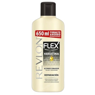 Acondicionador reparador Flex Keratin de Revlon Mass Market con keratina, específicamente formulado para cabello dañado o castigado. Refuerza y repara el cabello profundamente, desde la raíz hasta las puntas.