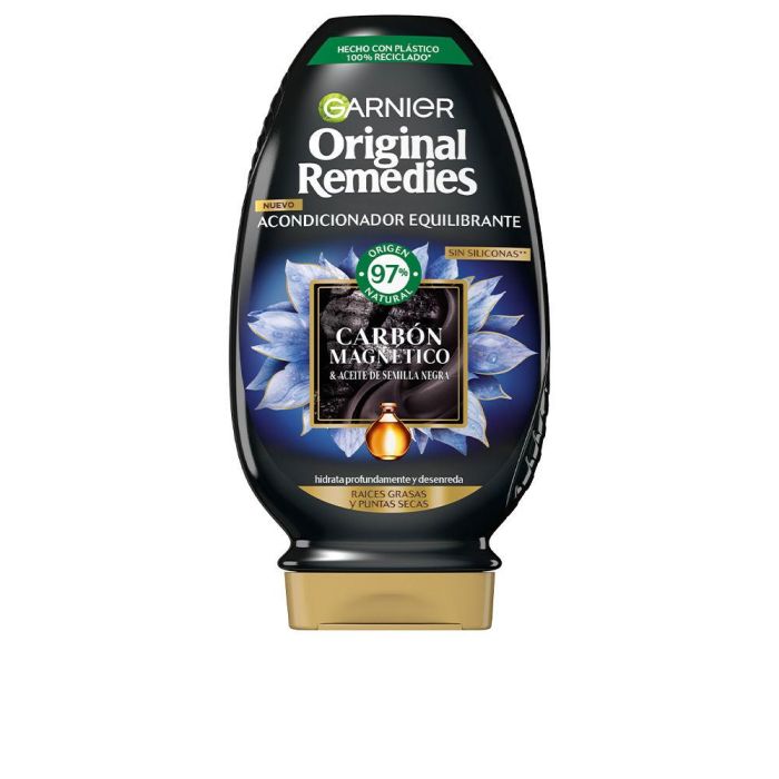 Descubre el Acondicionador Desenredante Carbón Magnético de Garnier Original Remedies, especialmente formulado para cabellos con raíces grasas y puntas secas. Su innovadora fórmula, con un 94% de ingredientes de origen natural, combina el poder del Carbón Magnético y la Semilla Negra para purificar y nutrir tu cabello.