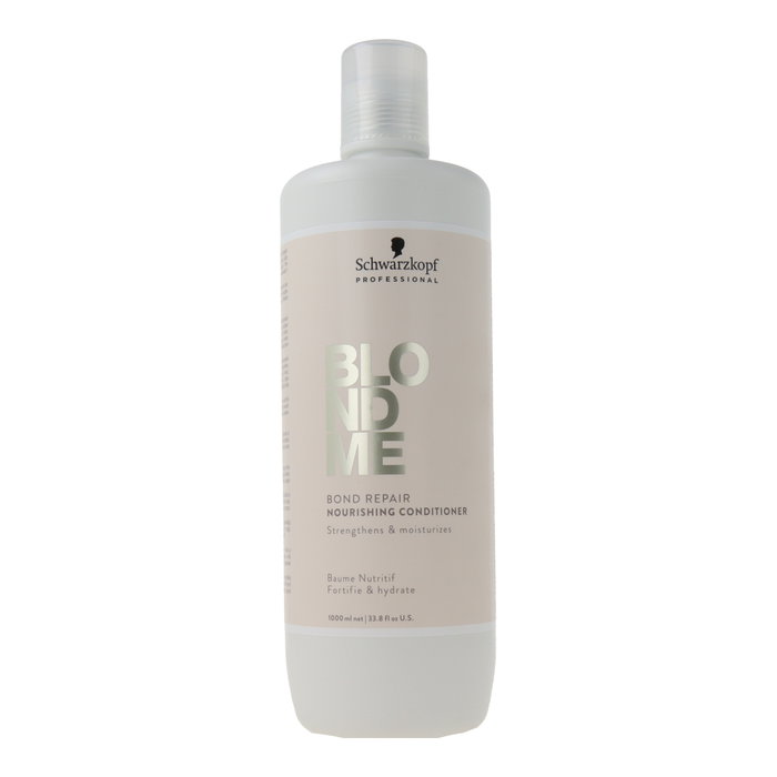 Acondicionador profesional BlondMe con tecnología Bond Repair que nutre fortalece y repara el cabello rubio o decolorado mejorando la suavidad y reduciendo la rotura.