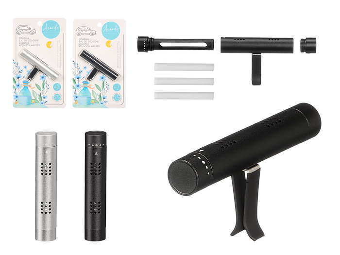 Acorde Ambientador de Coche con 3 Recambios de Colonia Surtidos - Aluminio, Plata/Negro, Dimensiones: 8 x 4 x 1.4 cm (Set de 24)
