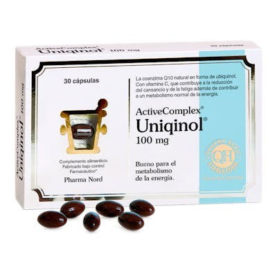 Indicaciones: ActiveComplex Uniqinol 100 mg QH son cápsulas de gelatina blanda protegida contra la luz que contiene la forma reducida de la coenzima Q10 (QH), ubiquinol en aceite de coco. Cada cápsula contiene 100 mg de ubiquinol y 12 mg de ácido ascórbico. Los complementos alimenticios con ubiquinol tienen un inconveniente, el ubiquinol se oxida una vez que se expone al oxígeno y por lo tanto vuelve a su forma original, la ubiquinona. Sin embargo, mediante un proceso de fabricación especial, Pharma Nord ha logrado encapsular la materia prima de una manera que permite mantener la forma reducida. Estas cápsulas de gelatina blanda, patentadas, protegen ActiveComplex Uniqinol 100 mg QH de la luz y la oxidación para administrar el compuesto en su forma prevista dentro de su cuerpo. ActiveComplex Uniqinol 100 mg QH es un antioxidante potente y ayuda al cuerpo reponiendo los niveles de Q10 en el cuerpo.