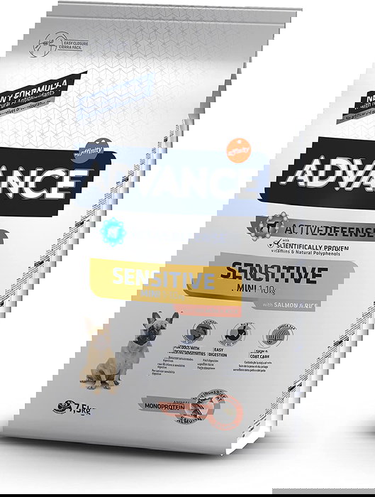 Este pienso, además de tener una excelente calidad, es perfecto para los perros de razas pequeñas: gracias a su pequeño tamaño pueden masticarlo sin dificultad y, al contener pocas proteínas y grasas, se adecúa a su metabolismo. Si tu perro padece intolerancia a las proteínas de la carne, este es el pienso adecuado, pues está compuesto principalmente por salmón. Advance Mini Sensitive es rico enácidos grasos omega 3 y 6, que mejoran el aspecto de la piel y del pelo.