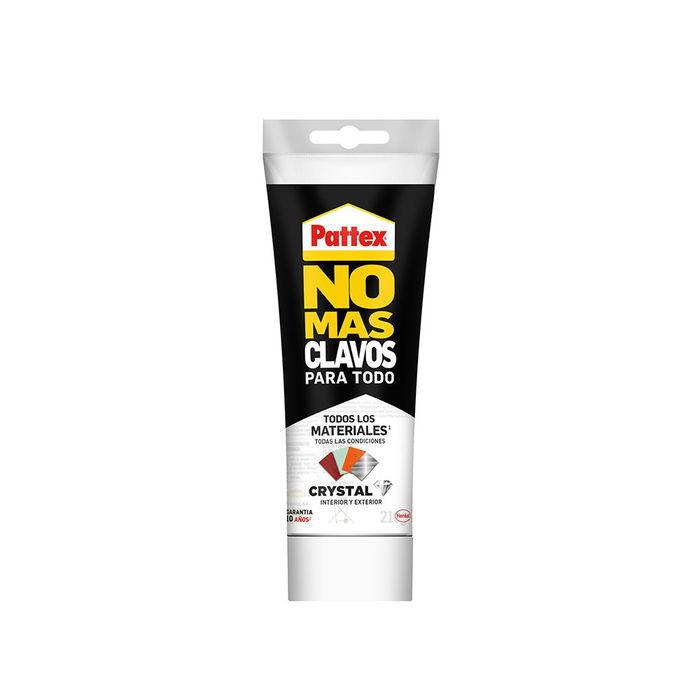 Pattex no mas clavos para cristal 216g es un adhesivo transparente libre de disolventes basado en la tecnologia flex tec de henkel, ideal para realizar trabajos de reparacion, bricolaje y montaje en general. ofrece un excelente poder de pegado para todo tipo de aplicaciones, materiales y situaciones. apto para materiales porosos y no porosos como madera, corcho, cemento, mortero, piedra, textiles, carton, cristal, vidrio, ceramica, azulejos, pvc, plasticos, espejos...