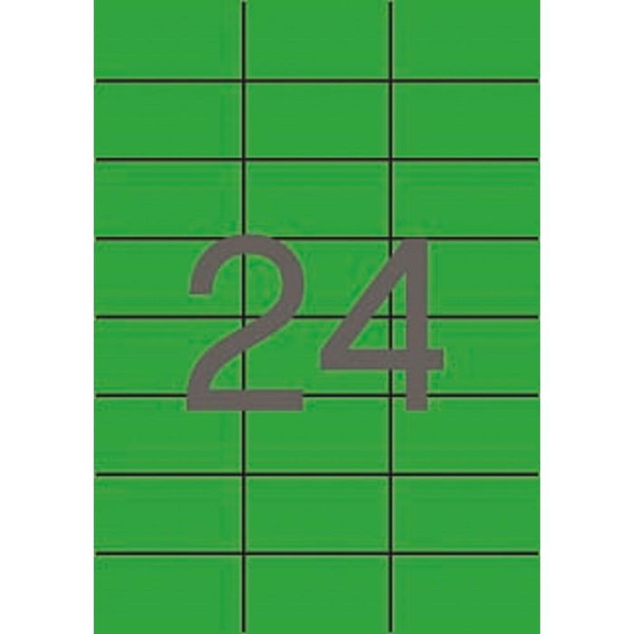 Etiquetas verdes cantos rectos tamaño 70,0 x 37,0 mm con adhesivo permanente. Pack con 20 hojas (480 etiquetas). Las etiquetas de colores son ideales para destacar tu información en un sobre de envío, paquete u objeto. Excelente calidad de impresión en impresoras inkjet, láser o fotocopiadoras. Descarga el software gratuito para diseñar e imprimir todo tipo de etiquetas en