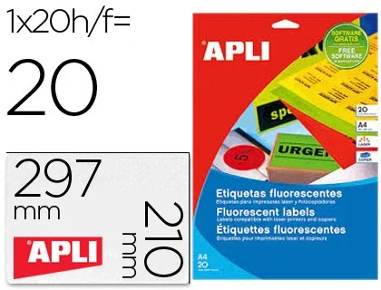 Etiquetas adhesivas en colores fluorescentes para destacar los mensajes sobre la superficie pegada. Para impresoras láser y fotocopiadoras. Adhesivo permanente. Formato DIN A4. El pack de 20 hojas.