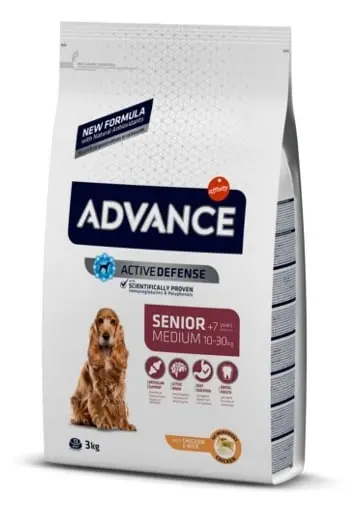 Advance Canine Senior Medium Pollo Arroz es un alimento completo para perros adultos mayores de raza mediana, elaborado por la marca Affinity. Su fórmula está basada en pollo y arroz, proporcionando un equilibrio nutricional específico para esta etapa vital. Este saco tiene un contenido neto de 3 kilogramos.