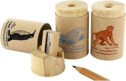 Sacapuntas ecológico con depósito estampado, la tapa es de madera, mientras que el recipiente es de cartón grueso ecológico. Un afilalápiz cilíndrico con estampados delfín, mono o pingüino.