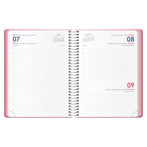 Agenda con cubiertas en papel impreso a todo color plastificado, en cartón contracolado, con puntas redondeadas, encuadernación con espiral metálico color negro y cierre de goma elástica plana de color. Bloque interior: 336 hojas de papel offset blanco de 70 g/m² impreso a dos colores (certificado FSC Mixto). Contenido: datos personales, calendario trienal, planning del año, indicativos internacionales y páginas para anotaciones. Anualidad: sábado y domingo en la misma página, cabeceras en cinco idiomas (castellano, catalán, gallego, euskera y portugués), onomástica, semana, calendarios del mes actual y siguiente.