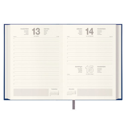 Agenda con cubierta realizada en polipiel con cartón almohadillado, estampación del año con película de color plata en la portada, encuadernación cosida con lomo redondo, cabezada y cinta de registro color gris, bloque interior: 336 hojas de papel offset ahuesado de 70 g/m² impreso a un color (certificado FSC Mixto). Contenido: datos personales, calendario trienal, planning del año, indicativos internacionales, páginas para anotaciones y listín telefónico. Anualidad: sábado y domingo en la misma página, cabeceras en cinco idiomas (castellano, catalán, gallego, euskera y portugués), onomástica, días transcurridos y restantes, semana, calendarios del mes actual y siguiente. Mapa de carreteras de España y Portugal en dos páginas a todo color al final de la agenda.