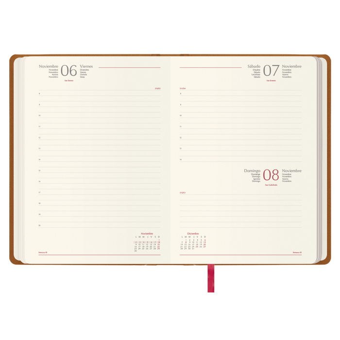 Agenda anual con cubierta realizada en polipiel con cartón contracolado, almohadillada y con costura perimetral. Estampación del año en seco. Interior con sábado y domingo en la misma página, impresa a dos colores en papel ahuesado de 80 g/m². 336 páginas. Datos personales, calendario trienal, planning del año, indicativos internacionales, páginas para anotaciones y listín. Cabeceras en 5 idiomas (castellano, catalán, gallego, euskera y portugués), onomástica, días transcurridos y restantes, semana, calendarios del mes actual y siguiente. Mapa de carreteras de España y Portugal en 4 páginas.