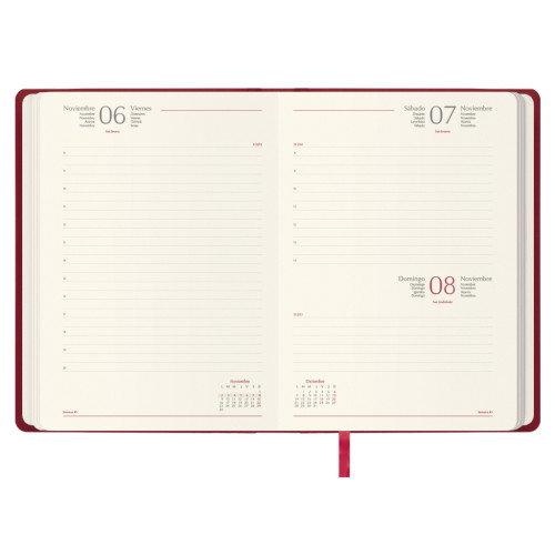 Agenda anual con cubierta realizada en polipiel con cartón contracolado, almohadillada y con costura perimetral. Estampación del año en seco. Interior con sábado y domingo en la misma página, impresa a dos colores en papel ahuesado de 80 g/m². 336 páginas. Datos personales, calendario trienal, planning del año, indicativos internacionales, páginas para anotaciones y listín. Cabeceras en 5 idiomas (castellano, catalán, gallego, euskera y portugués), onomástica, días transcurridos y restantes, semana, calendarios del mes actual y siguiente. Mapa de carreteras de España y Portugal en 4 páginas.