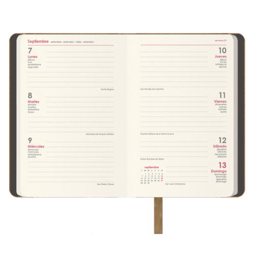 Agenda anual con cubierta flexible realizada en polipiel con cartulina negra contracolada de primera calidad y puntas redondeadas. Estampación del año en color negro en la portada. Encuadernación cosida con lomo redondo y cierre de goma elástica plana y cinta de registro en color negro. Interior semana vista tamaño bolsillo, impresa a un color en papel offset ahuesado de 70 g/m². 144 páginas. Datos personales, calendario trienal, planning del año, páginas para anotaciones y listín. Cabeceras en 5 idiomas (castellano, catalán, gallego, euskera y portugués), onomástica, días transcurridos y restantes, semana, calendarios del mes actual y siguiente. Mapa de carreteras de España y Portugal en dos páginas.