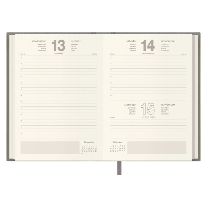 Agenda anual con cubierta realizada en polipiel con cartón almohadillado de primera calidad. Estampación del año en seco en la portada. Interior con sábado y domingo en la misma página, impresa a un color en papel offset ahuesado de 70 g/m². 336 páginas. Datos personales, calendario trienal, planning del año, páginas para anotaciones y listín. Cabeceras en 5 idiomas (castellano, catalán, gallego, euskera y portugués), onomástica, días transcurridos y restantes, semana, calendarios del mes actual y siguiente. Mapa de carreteras de España y Portugal en dos páginas.