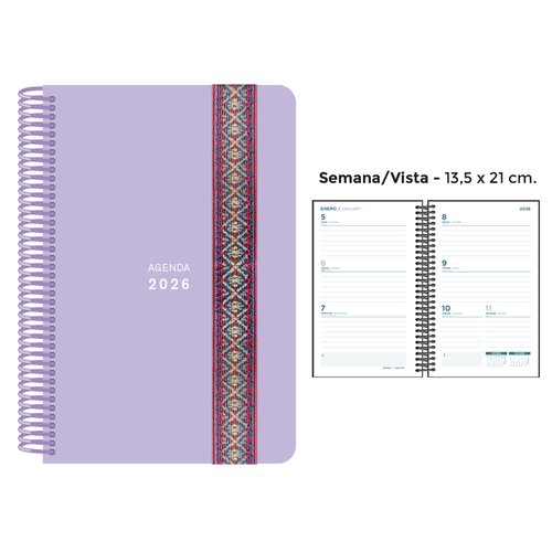 Agenda Anual (2026) Senfort Pastel Espiral Tapa Pp Con Goma Decorada 135X210 S/V Lila