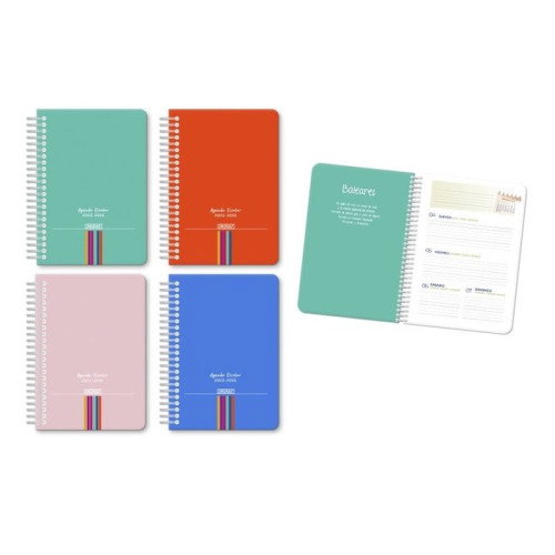 Agenda escolar 2025-2026 4ª SV Tapa carton forrada y espiral plástica . Papel de 80 grs.Tamaño 15X21cm.65hojas-130 páginas Agenda escolar 10 meses, de septiembre 2025 a Junio de 2026. 4 idiomas : Castellano , Euskera, catalón y Gallego Incluye información variada : Datos personales calendarios anuales, hojas de examenes, ausencias y retrasos Hojas interiores de color Planning mensual al inicio de cada mes.