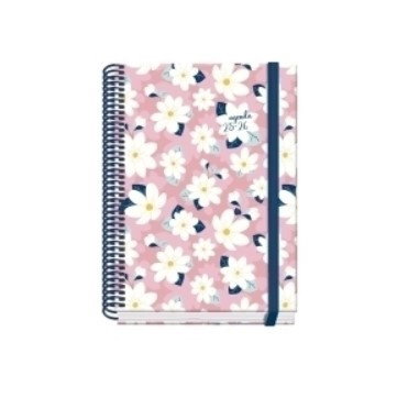 Cubierta en cartón forrado con papel impreso a todo color y plastificado. Guardas impresas. Espiral simple de plástico y cierre de goma elástica plana de color. Interior en papel offset de 70 g/m2 y 4 hojas de pegatinas impresas a todo color. Con certificado FSC Mixto.