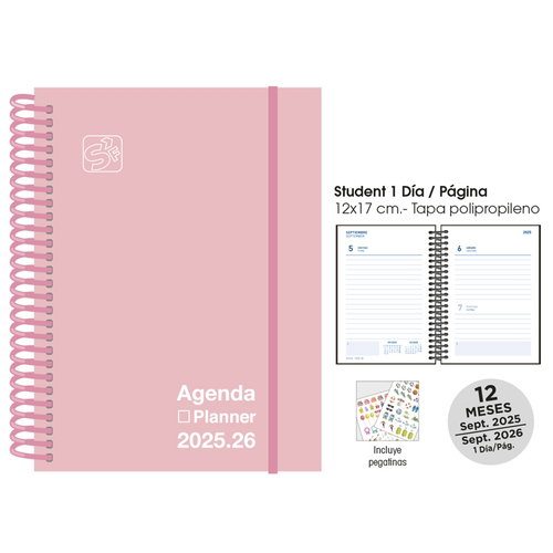 AGENDA ESCOLAR (2025-26) SENFORT CATALAN STUDENT UNICOLOR ESPIRAL tapa PP con GOMA 120x170 D/P PASTEL ROSA