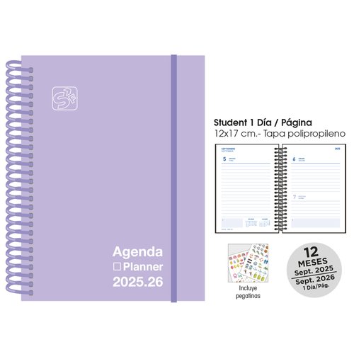 Agenda Escolar (2025-26) Senfort Student Unicolor Espiral Tapa Pp Con Goma 120X170 D/P Pastel Lila