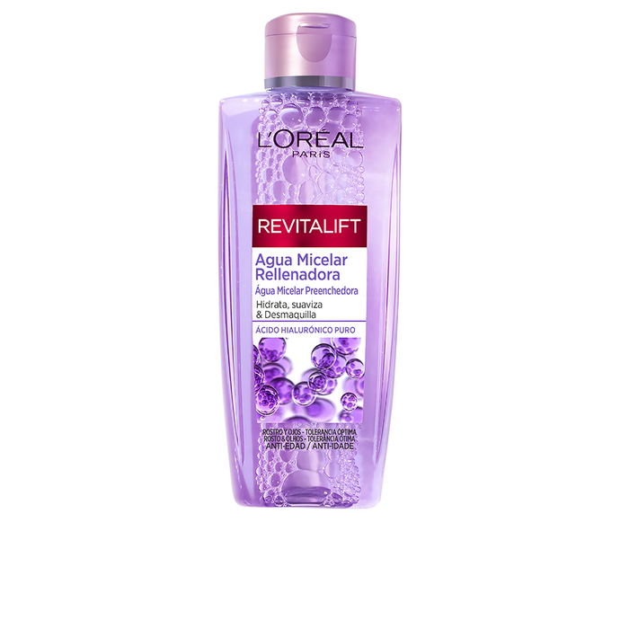 Descubre el Agua Micelar Revitalift Filler de L'Oréal Paris. Esta innovadora fórmula con ácido hialurónico puro está diseñada para limpiar en profundidad, eliminar el maquillaje e hidratar la piel al mismo tiempo. Perfecta para todo tipo de pieles, su uso regular deja la piel fresca, limpia y con una sensación de suavidad. Es un tratamiento anti-edad que aporta el poder rellenador del ácido hialurónico durante tu rutina diaria de desmaquillado. Ideal para la mujer que busca una solución de limpieza eficaz y un cuidado integral para su cutis.