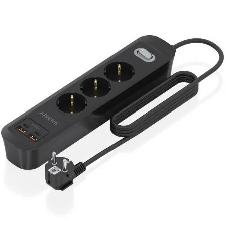 AISENS - REGLETA DE ENCHUFES MULTIFUNCION CON 3 TOMAS + CARGADOR PD3.0 20W 2xUSB-C, 2xUSB-A, 1.4M, NEGRO