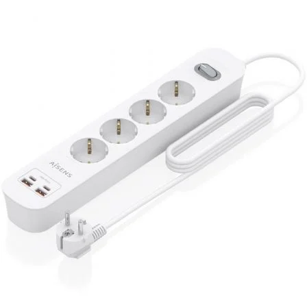 AISENS - REGLETA DE ENCHUFES MULTIFUNCION CON 4 TOMAS + CARGADOR PD3.0 20W 2xUSB-C, 2xUSB-A, 1.4M, BLANCO