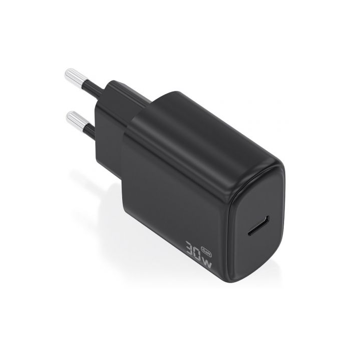 Cargador GaN USB-C de 30W diseñado para cargar portátiles, teléfonos móviles, cámaras y tablets, entre otros dispositivos. Presenta un diseño elegante, moderno y práctico.