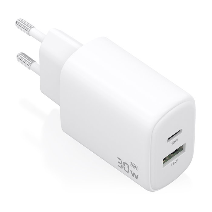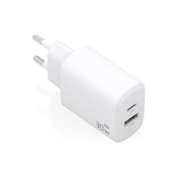 AISENS - CARGADOR GaN 30W, 1xUSB-C PD3.0 QC4.0, 1xUSB-A QC3.0, BLANCO