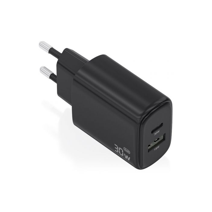 AISENS - CARGADOR GaN 30W, 1xUSB-C PD3.0 QC4.0, 1xUSB-A QC3.0, NEGRO