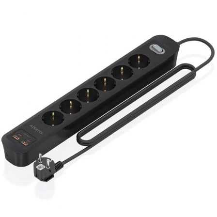 AISENS - REGLETA DE ENCHUFES MULTIFUNCION CON 6 TOMAS + CARGADOR PD3.0 20W 2xUSB-C, 2xUSB-A, 1.4M, NEGRO