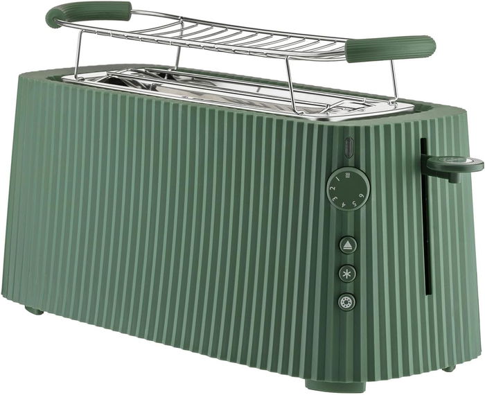 - Diseñada por Michele De Lucchi, esta tostadora de diseño de doble compartimento permite tostar hasta cuatro rebanadas de pan simultáneamente. Ideal para preparar un desayuno o una merienda para compartir con la familia o los amigos. El nuevo accesorio, el calentador de brioches, puede utilizarse para mantener a temperatura las rebanadas de pan ya tostadas, o para calentar croissants, pizzas u otros productos horneados. Sus múltiples funciones permiten: elegir hasta seis niveles de tostado, utilizar la función de descongelación que descongela el pan antes de iniciar el proceso de tostado, utilizar la función bagel que permite calentar sólo una cara del pan y una función de parada que activa la expulsión automática del pan.