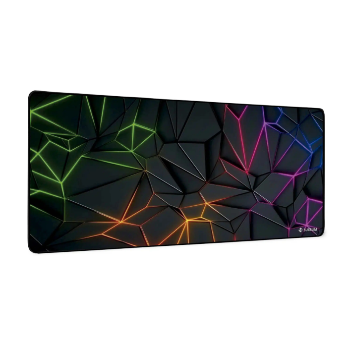 Geometría facetada con aristas verde-amarillo-naranja-rosa-violeta que simula iluminación RGB, transforma tu escritorio y resiste decoloración tras lavados.