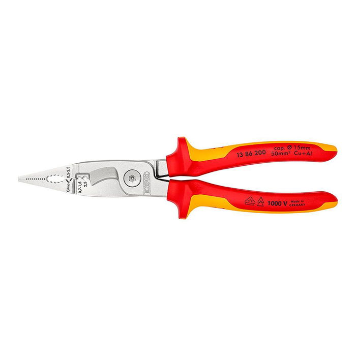 Alicates cromado para instalaciones eléctricas. mangos aislados con fundas multicomponentes, tiene 6 funciones - para sujetar material plano y redondo, doblar, desbarbar, cortar cables, pelar y crimpar punteras huecas. superficie de agarre lisa en la punta para agarrar los cables individuales. superficie de agarre dentada y mordaza para agarrar material plano y redondo. canto exterior marcado en la boca para manipular las cajas de los mecanismos eléctricos y desbarbar orificios de paso. orificios para pelar cables de 0,75 a 1,5 mm² y 2,5 mm². mordaza para crimpar punteras huecas de 0,5 a 2,5 mm². tijeras cortacables con filos de precisión (templados por inducción). seguridad con certificación vde hasta 1000v. 200 x 85 x 20 mm