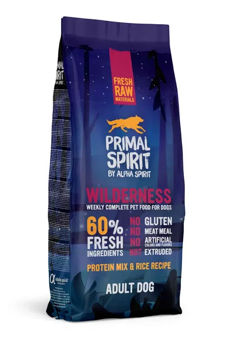Primal Spirit de Alpha Spirit es una alimentación natural para perros adultos, elaborada sin gluten, sin harinas cárnicas y sin colorantes ni saborizantes artificiales. Basada en la experiencia de Alpha Spirit, la receta Wilderness contiene un 60% de ingredientes frescos y destaca por su elevado contenido en carne y pescado, con una cantidad reducida de arroz hidrolizado.