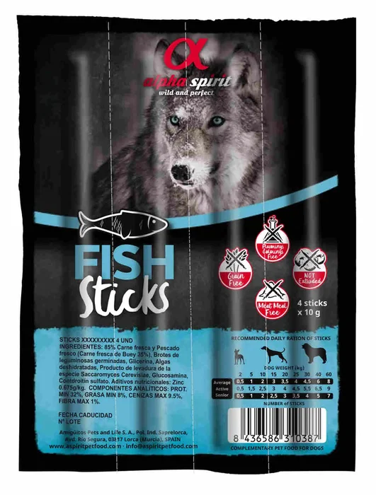 Alimento complementario para perros de la marca Alpha Spirit. Formulado con ingredientes de alta calidad: 55% pescado entero fresco, 20% pollo fresco, 10% hígado de cerdo, almidón hidrolizado y glicerina vegetal (USP). Ideal como suplemento nutritivo para la dieta de tu perro.