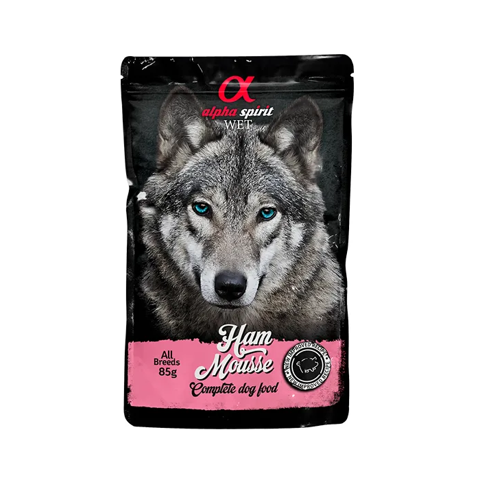 Alimento húmedo para perros de alta calidad de la marca Alpha Spirit. Cada envase contiene 24 unidades de 85 gramos cada una, con un delicioso sabor a jamón. Ideal para complementar la dieta de tu mascota con una opción sabrosa y nutritiva.