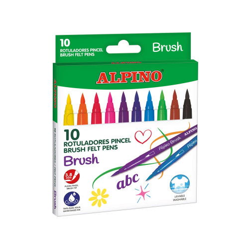 10 rotuladores escolares lavables con punta de pincel con tinta base agua y trazo 3.8 mm. Perfectos para lettering.