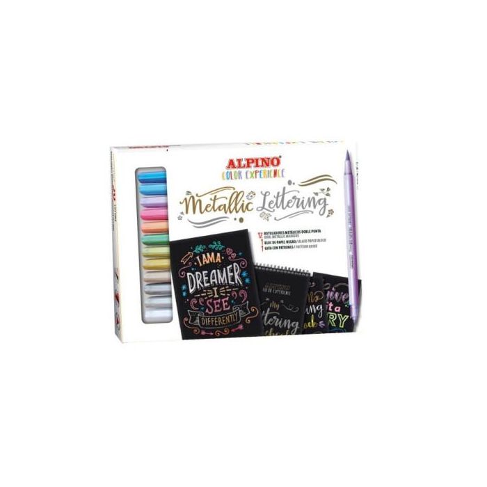 Alpino AR010701 Set Metallic Lettering con 12 Rotuladores Metálicos Doble Punta, Papel Negro y Guía