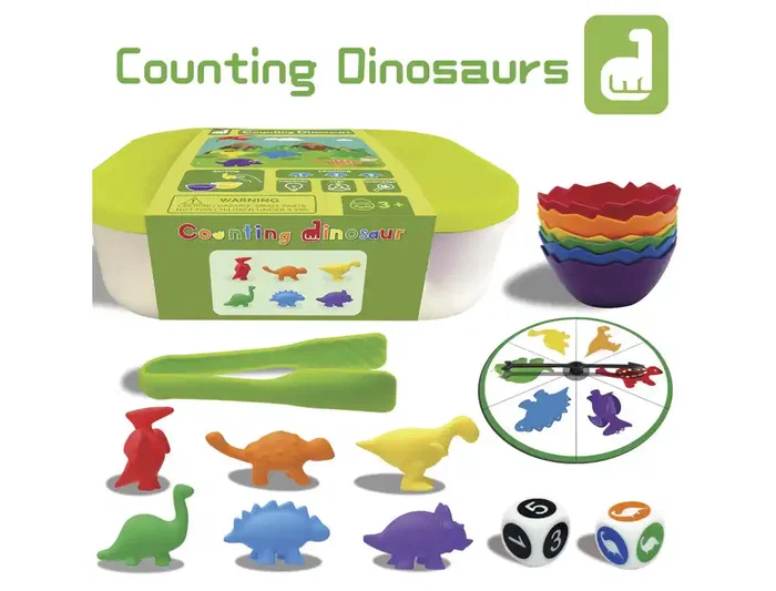 Amaya Juego Didáctico de Clasificación y Conteo de Dinosaurios +3 Años, 72 Piezas, 6 Tipos, Incluye Pinza, Vasos, Dados, Tarjetas y Caja, Aprendizaje por Color y Especie