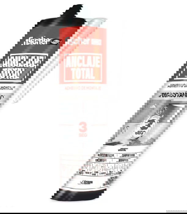 El adhesivo sellante Solución Total Cristal de Fischer (Ref. 570.951) es un polímero MS monocomponente, transparente y elástico, libre de disolventes, siliconas e isocianatos. Cura por humedad con reticulación neutra, y está diseñado para aplicaciones de pegado o sellado donde se desea mantener una estética limpia y sin color. Puede aplicarse sobre superficies húmedas y no absorbentes, siendo ideal para múltiples materiales en obra y reformas.